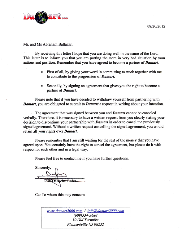 For some reasons, days after deposit two thousand dolars Abraham Baltazar doesn't want to complete the process to the partnership contract by refusing to give the two other thousand dolars. He want his money back. Now the problem is, Damart want him to sign a paper where he will confirm that willingly he decides to terminate everything and ask to get his money back. Damart is waiting for that paper before he gives the money back.