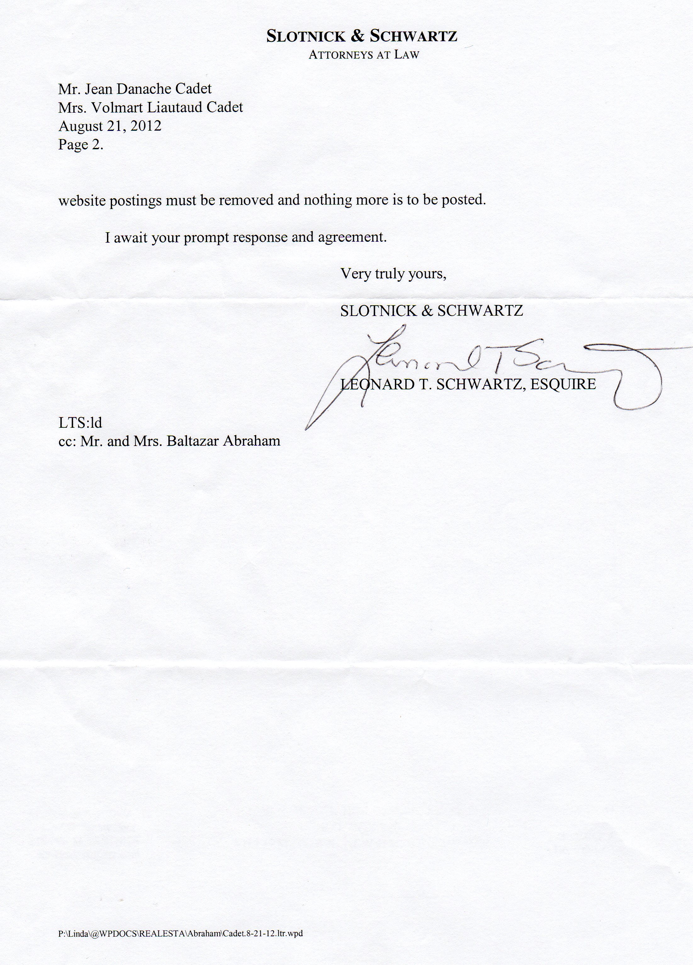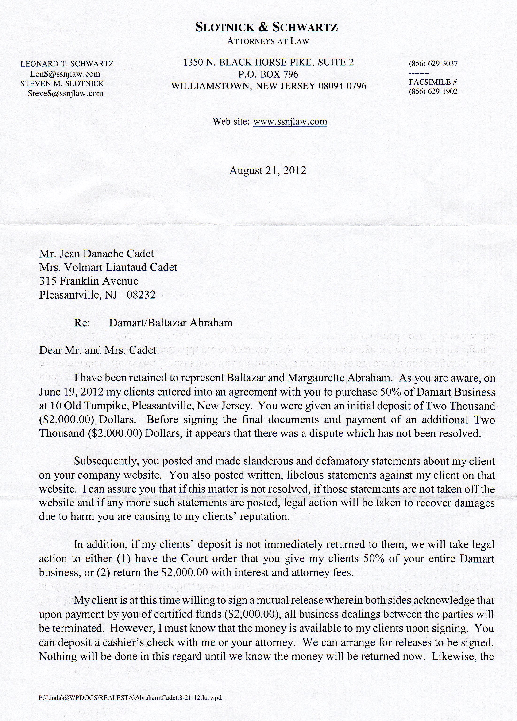 Today, Damart received a letter from the layers of Mrs. Baltazar Abraham. in that letter the layers ask Damart to give back the 2000 dollars very promptly. If not they will take 50% of Damart store or get the 2000 dollars back with interest and attorney fees. remember according to Damart he has no problem to give the money back the money is available, he wants Mr Baltazar to sign the paper first. ....................... to be continued. ************************************************************************